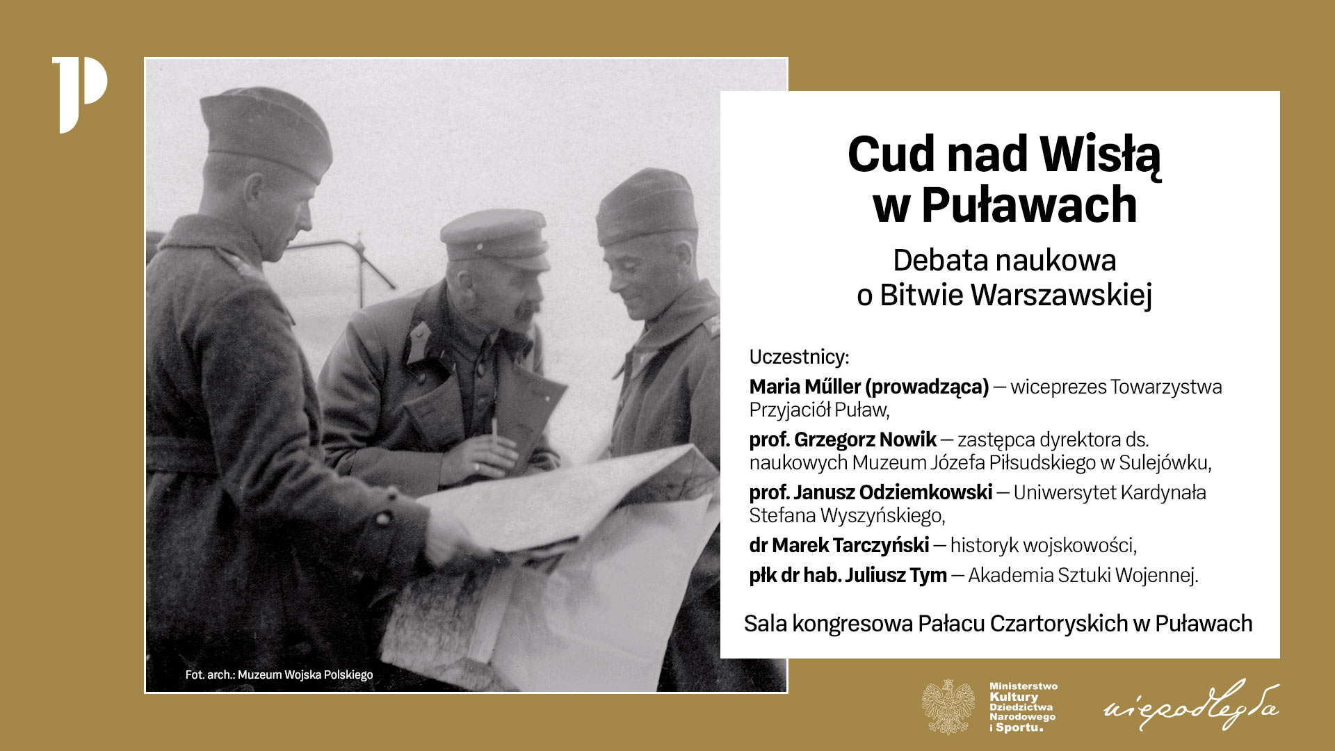 W Pałacu Czartoryskich, w którym obecnie ma siedzibę Instytut Uprawy, Nawożenia i Gleboznawstwa w Puławach, w decydujących momentach wojny polsko-bolszewickiej, mieściła się Kwatera Główna Naczelnego Wodza. Pałacowe mury pamiętają sierpniowe dni 1920 roku: narady sztabowe, działanie węzła łączności i Józefa Piłsudskiego, który wraz z oficerami Wojska Polskiego podejmował w Puławach decyzje rozstrzygające o losach bitwy, Polski i Europy. Jest to pierwsza debata z nowego cyklu, w ramach którego Biuro Programu „Niepodległa” i Muzeum Józefa Piłsudskiego w Sulejówku połączyły siły, by przybliżyć realia II Rzeczpospolitej, najciekawsze wydarzenia i postaci, znaczące procesy i ciekawostki z życia codziennego.