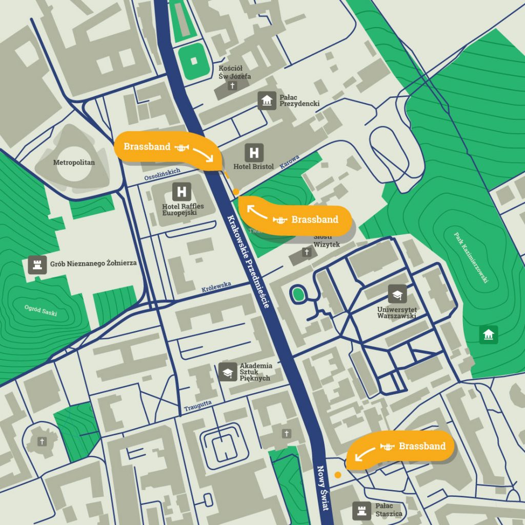 W godz. 14:00–18:15, w trzech lokalizacjach: na rogu ul. Karowej i Krakowskiego Przedmieścia, na placu przed pomnikiem Mikołaja Kopernika oraz na balkonie Hotelu Bristol występować będą znane i lubiane brass bandy. Znane melodie zachęcą do wspólnego śpiewania i rytmicznego przyklaskiwania!