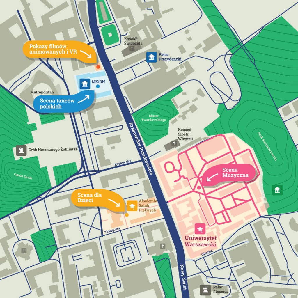 Tradycyjnie już w MKiDN muzycy tradycyjni uczą tradycyjnych tańców – oberków, kujawiaków mazurków – i zapraszają na parkiet. ASP to przestrzeń dla dzieci, gdzie warsztaty, występy i atrakcje przygotowano specjalnie z myślą o nich. UW to z kolei główna scena muzyczna, gdzie polskie zespoły i artyści w rytmach polskiej muzyki świętują razem.