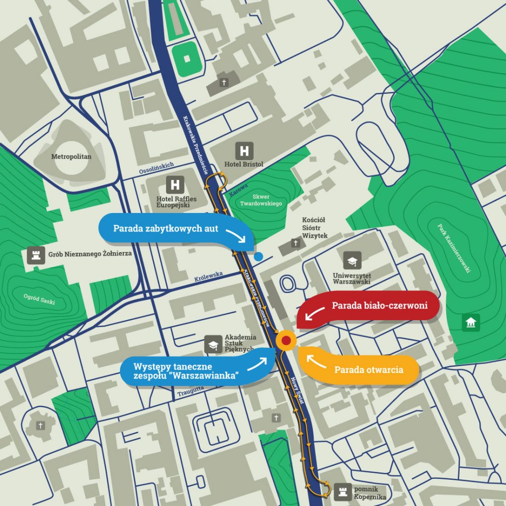 - Parada otwarcia – godz. 14:00 – Start z bramy głównej Uniwersytetu Warszawskiego w kierunku Ministerstwa Kultury i Dziedzictwa Narodowego;