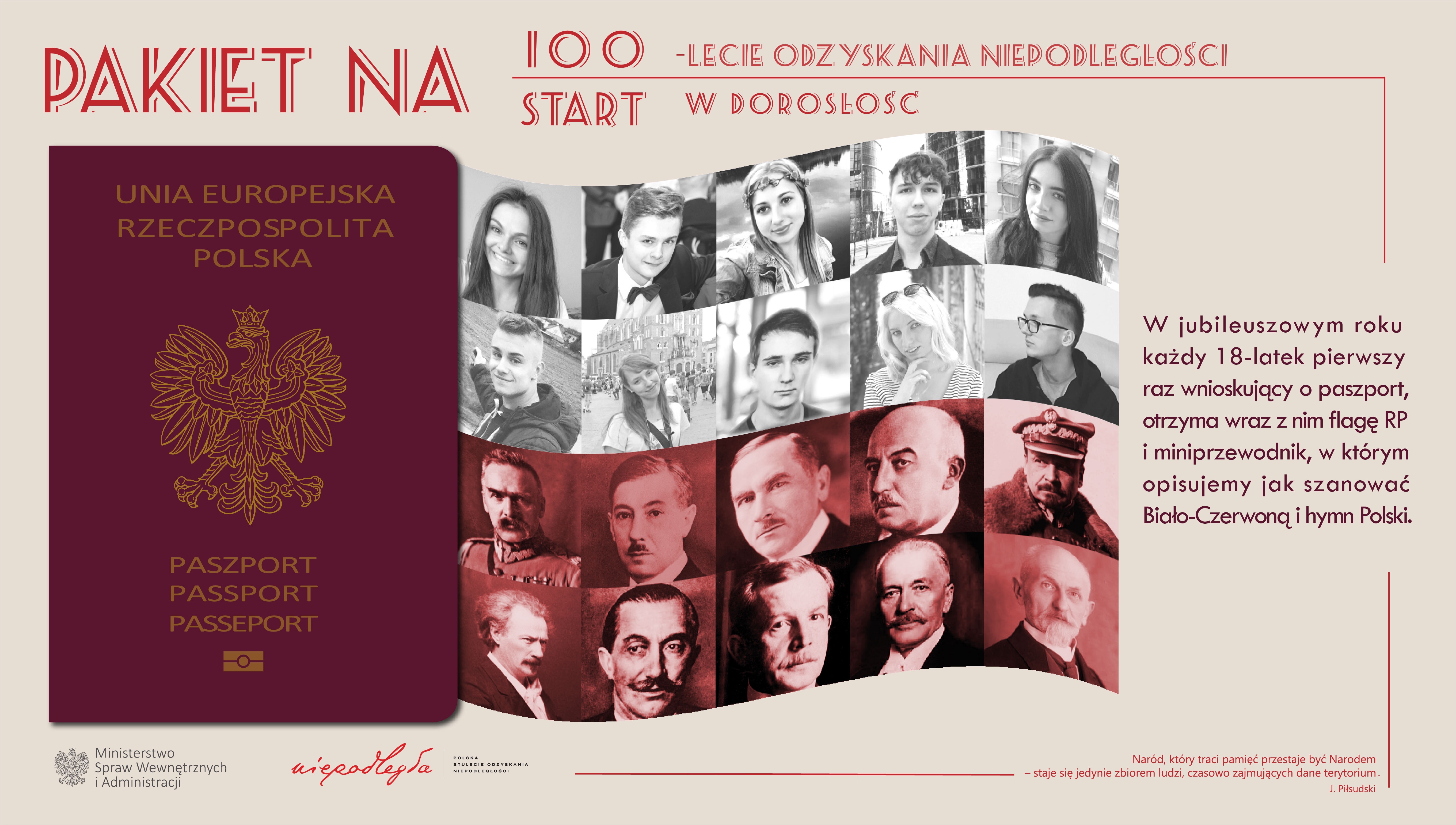 W związku ze stuleciem odzyskania przez Polskę niepodległości, każdy 18-latek wnioskujący po raz pierwszy o paszport, wraz z dokumentem otrzyma specjalny pakiet jubileuszowy. Wkraczający w dorosłość nastolatkowie, w kopercie znajdą polską flagę wraz z miniprzewodnikiem dotyczącym szacunku do flagi, barw narodowych i hymnu oraz znaczek z logo „Niepodległej”. Na kopercie znajdują się także wizerunki Piłsudskiego, Kwiatkowskiego, Dmowskiego, Narutowicza, Hallera, Paderewskiego, Witosa, Korfantego, Mościckiego, Wojciechowskiego i młodych ludzi.