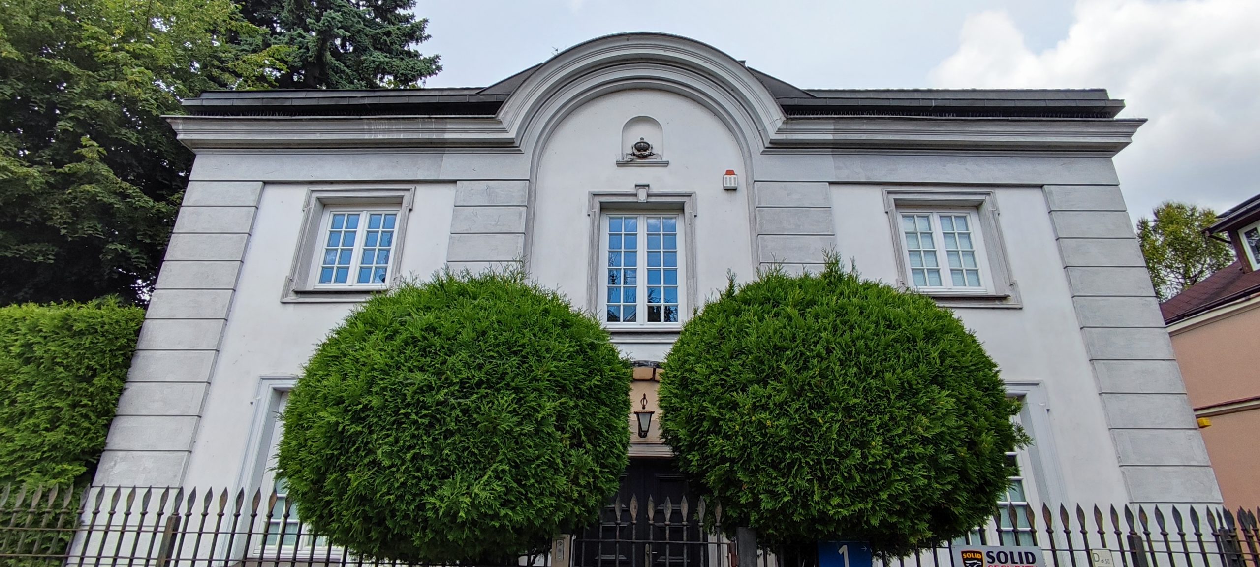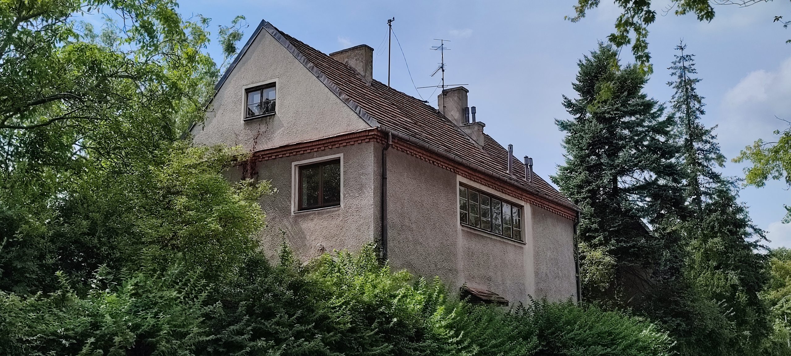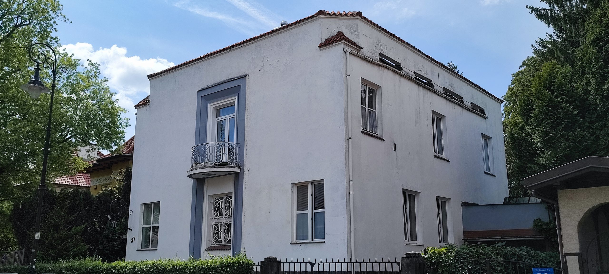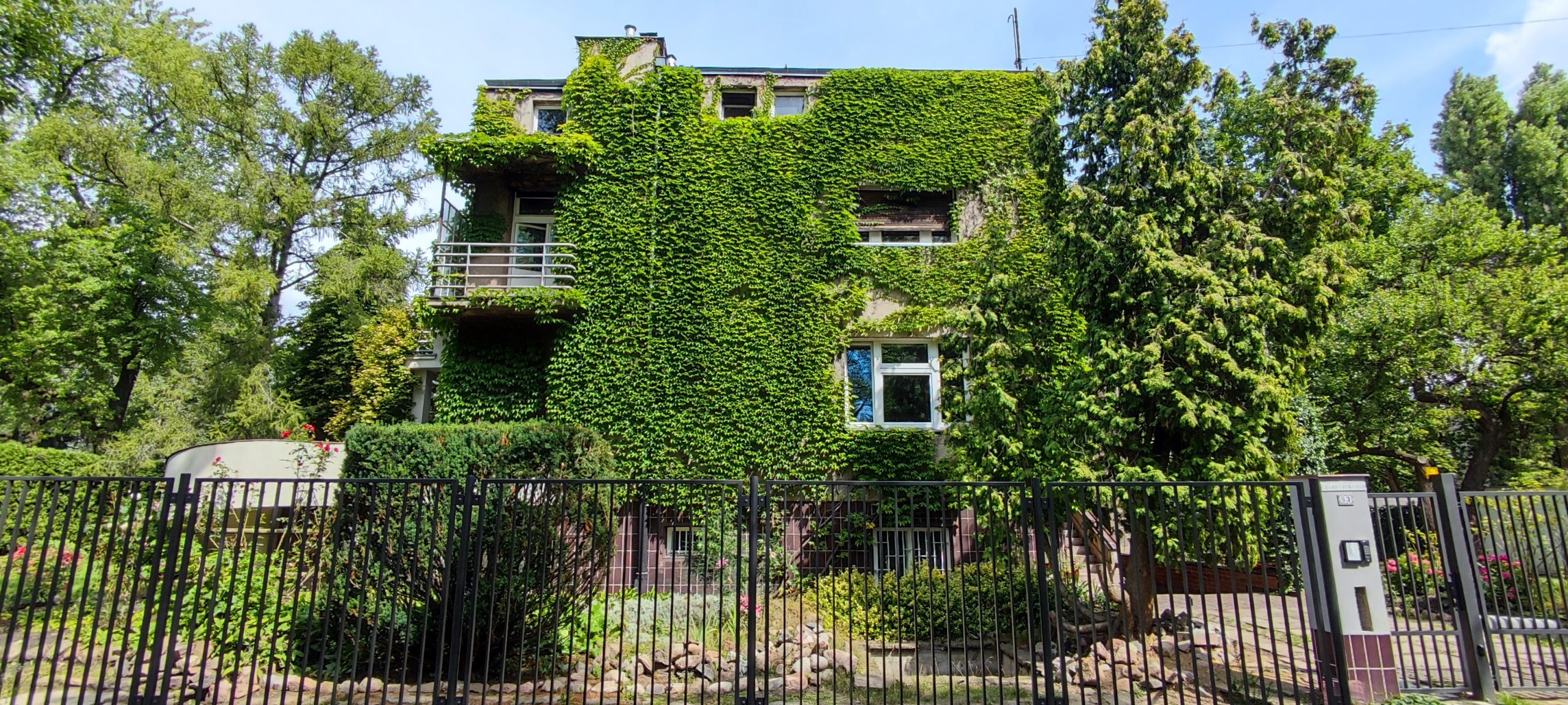 Obrośnięta bluszczem elewacja domu z lat 30. XX wieku, zaprojektowanego dla Zygmunta Rakowicza.