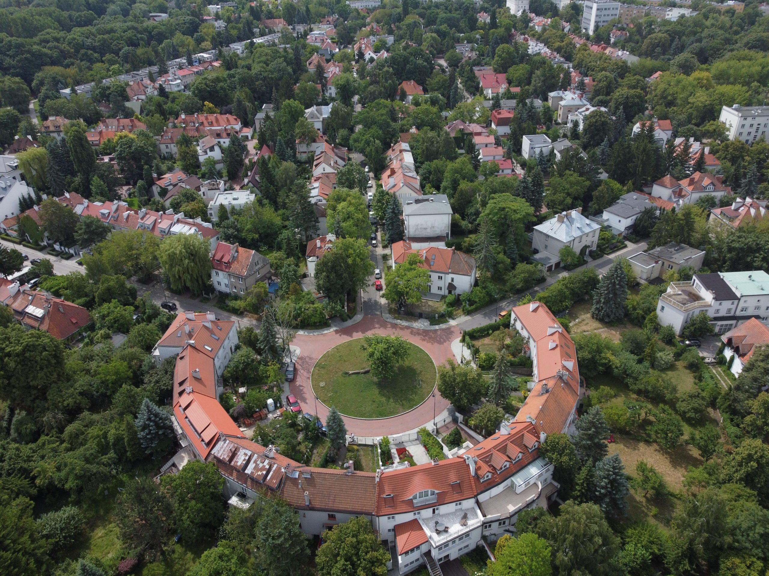 Plac Słoneczny z rozchodzącymi się promieniście ulicami Śmiałą i Forteczną. Widoczna zabudowa w stylu dworkowym.