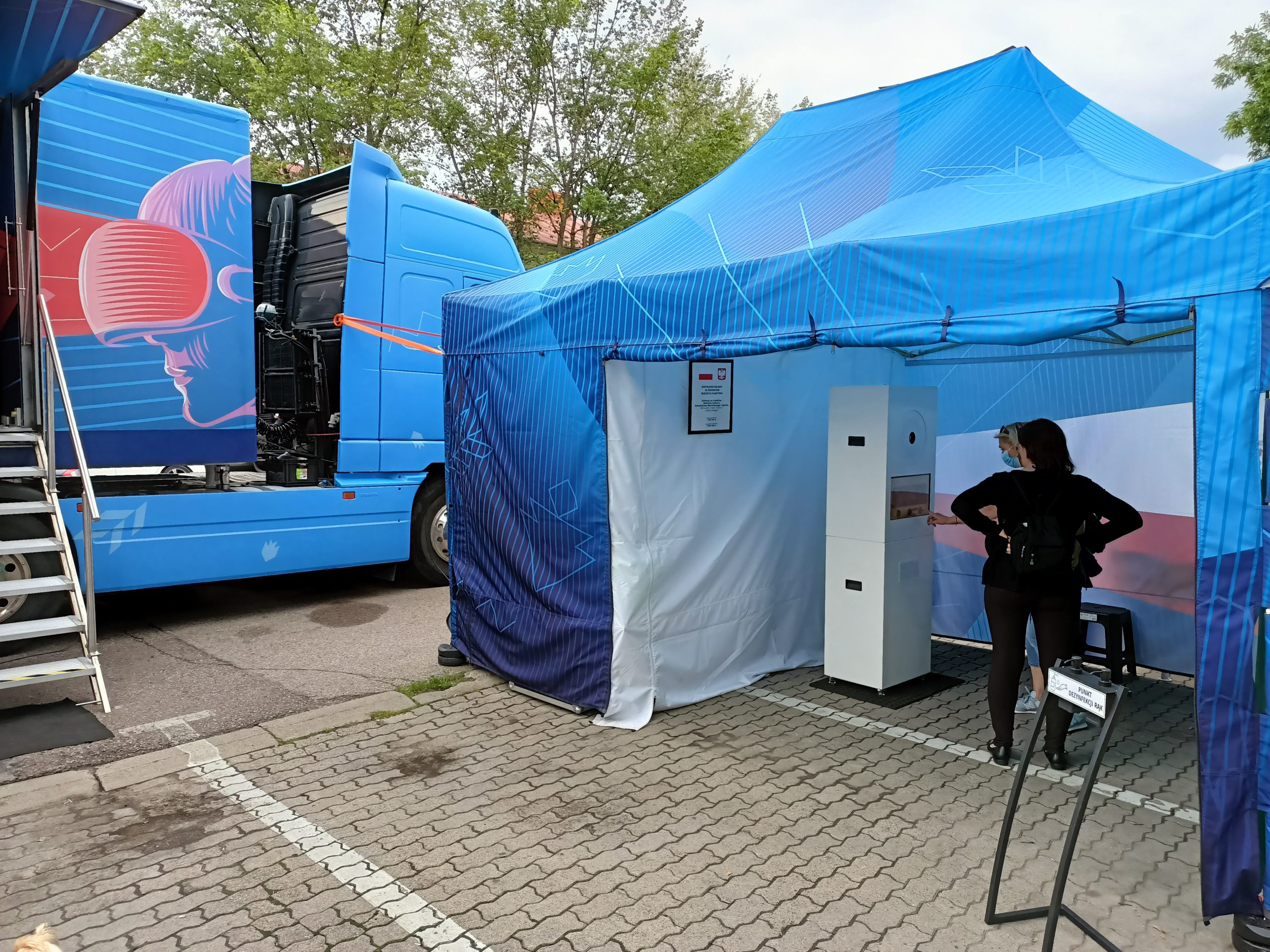 rozstawiony bus i namiot z fotobudką na parkingu, w tle drzewa