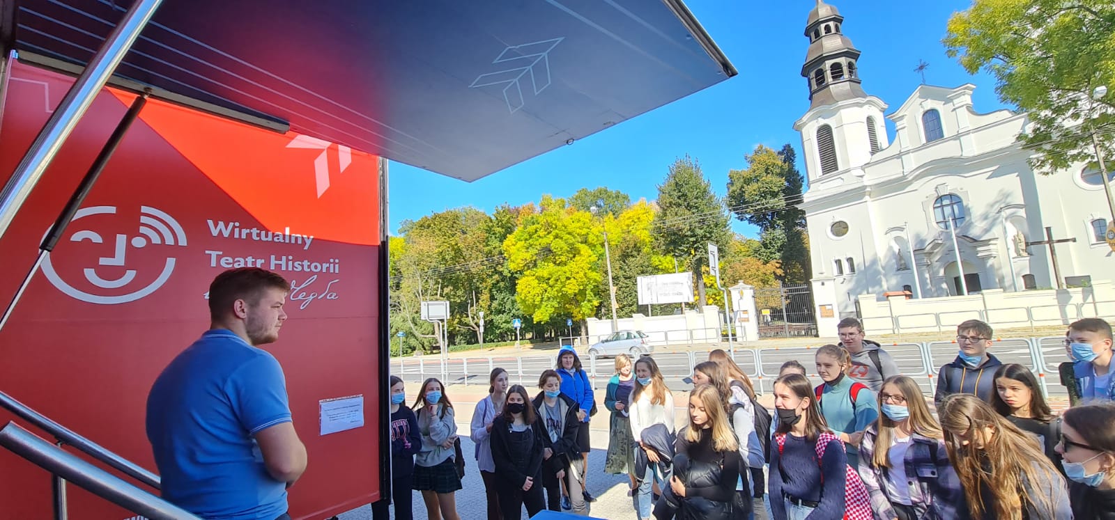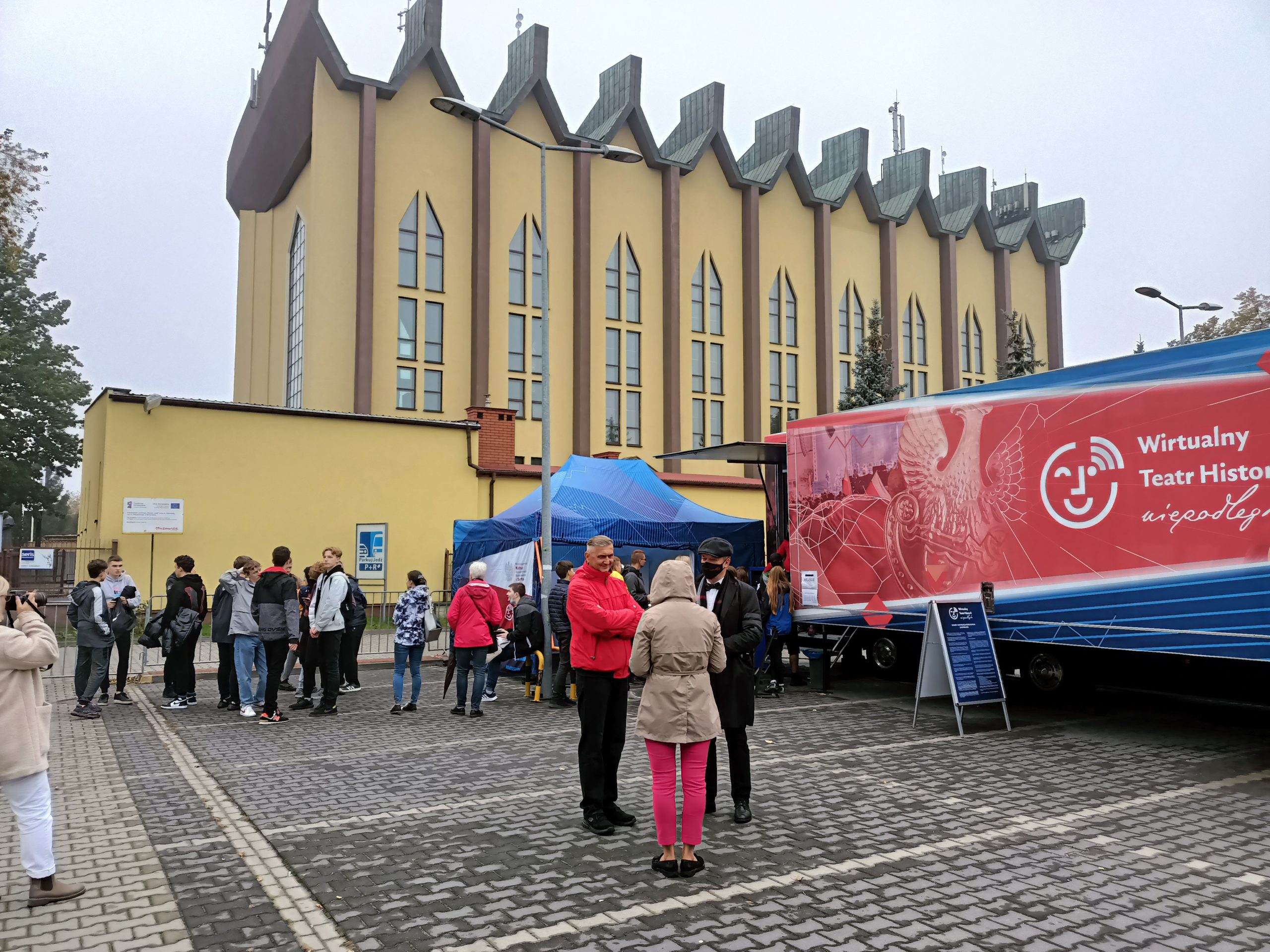 grupa oczekujących na wejście do Wirtualnego Teatru Historii "Niepodległa; w tle kościół