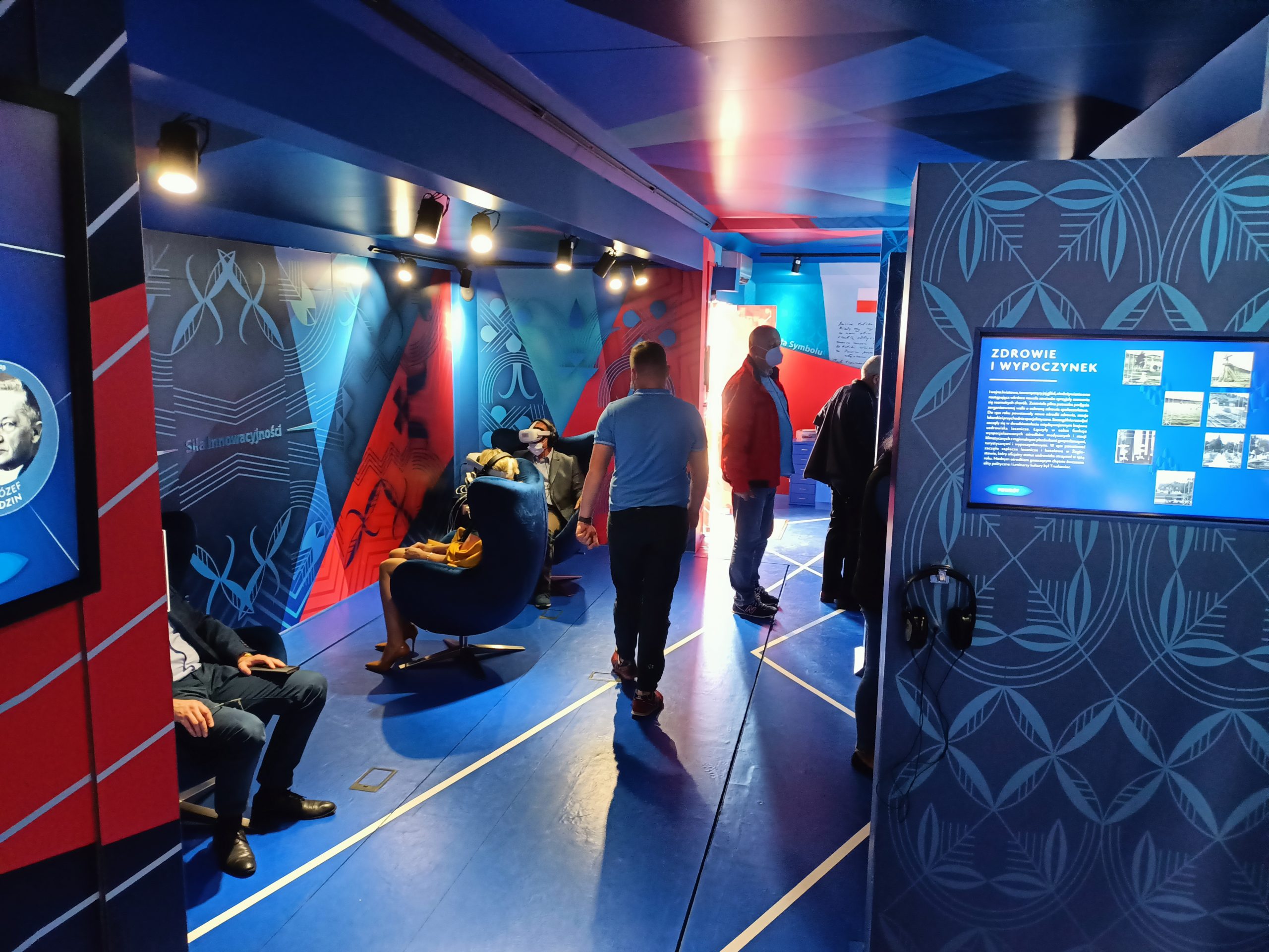grupa osób zwiedzająca wnętrze Wirtualnego Teatru Historii "Niepodległa"