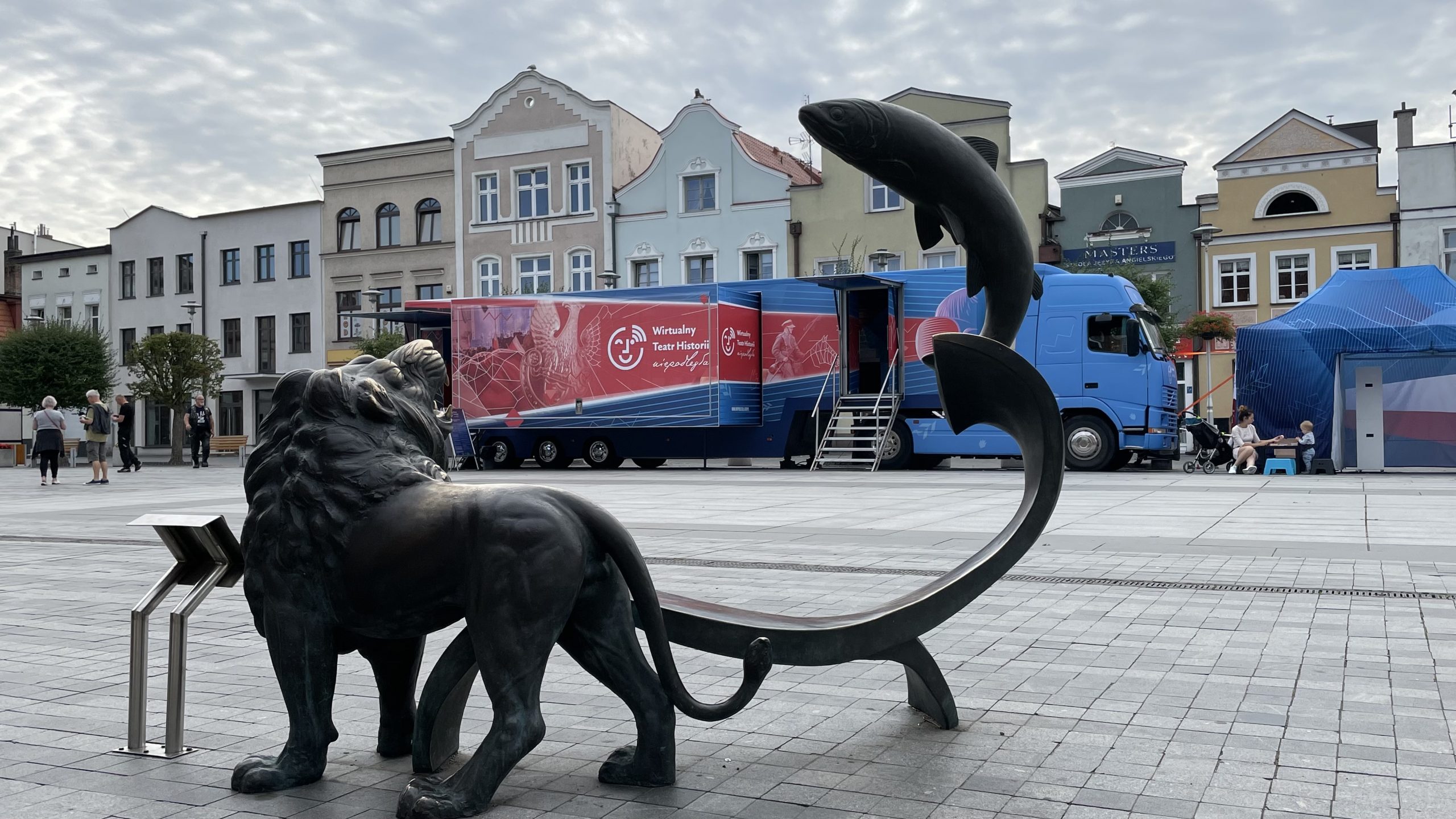 rozstawiony bus i namiot z fotobudką na rynku, na pierwszym planie pucka rzeźba