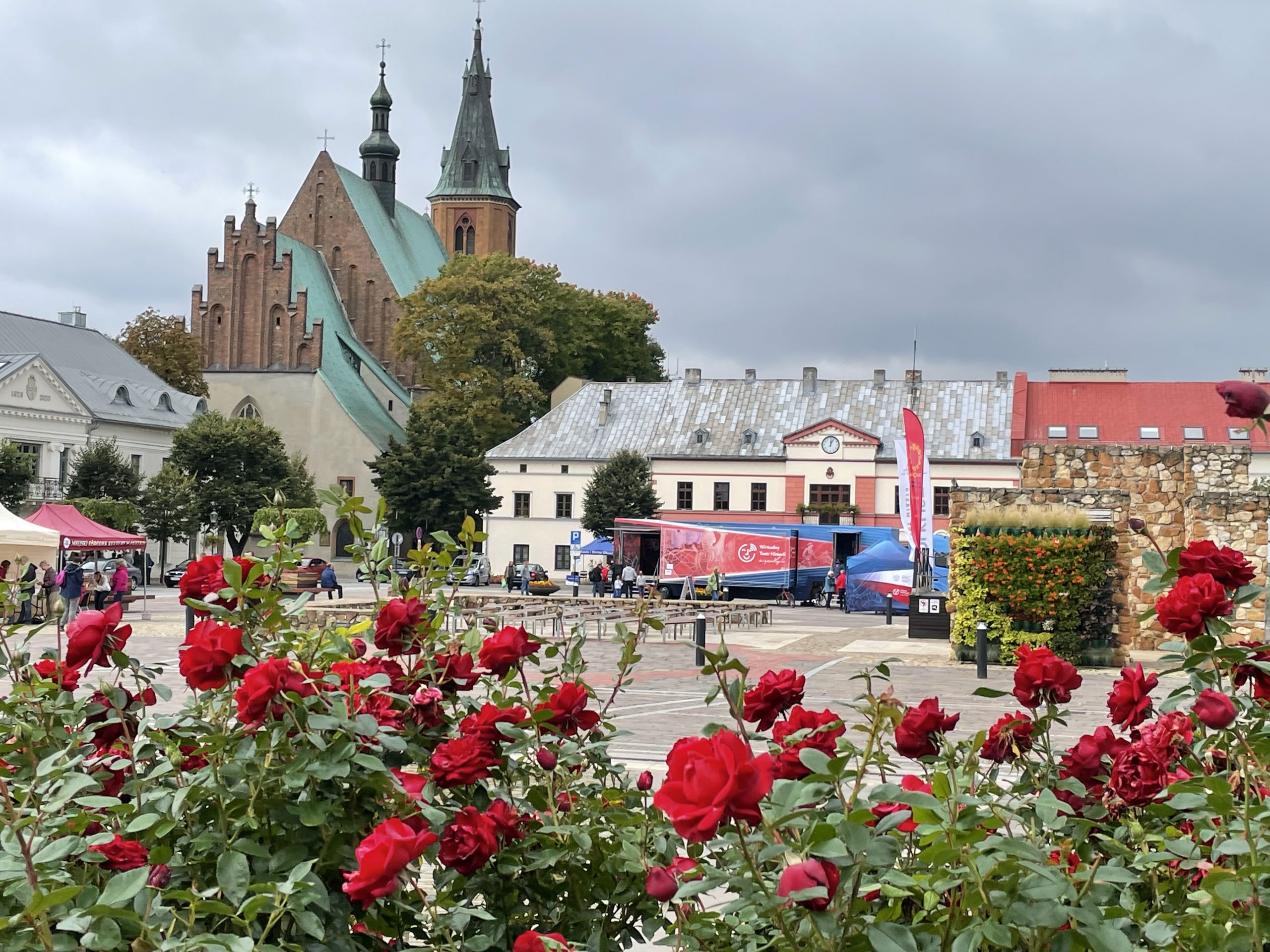 Wirtualny Teatr rozstawiony na rynku w Olkuszu, po lewej katedra, na pierwszym planie róże