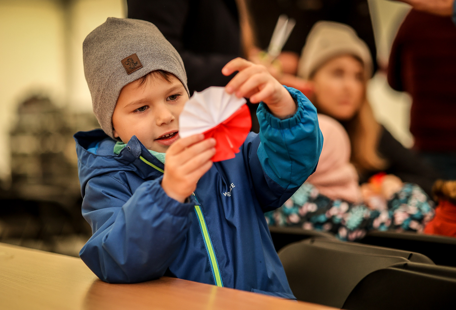 chłopczyk z biało-czerwoną ozdobą którą wykonał