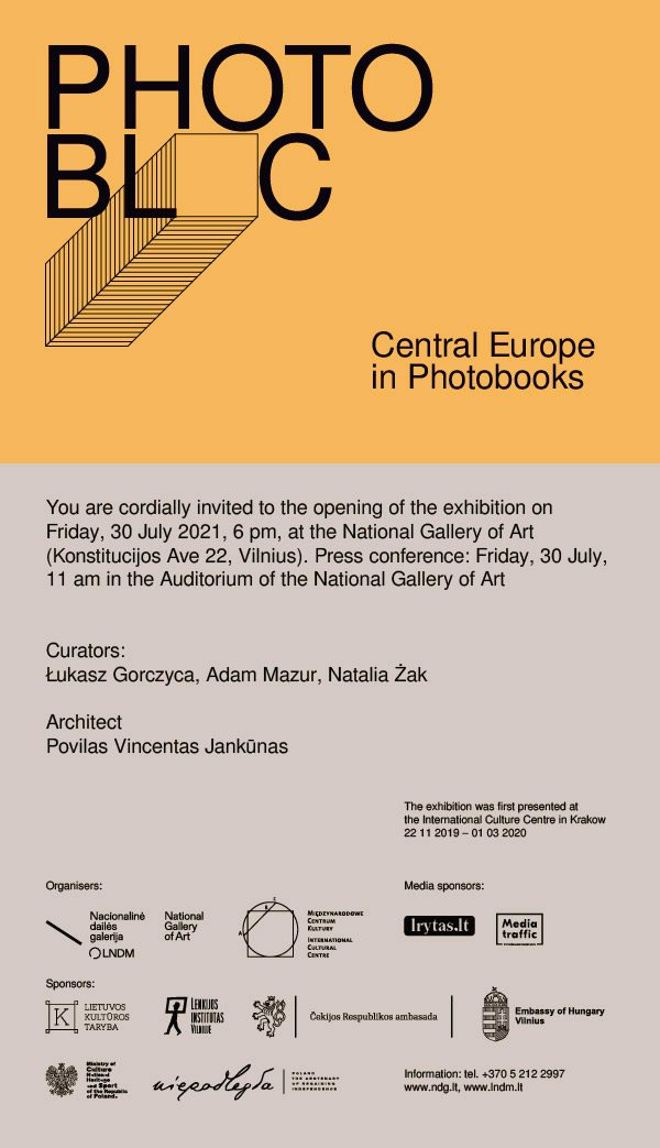 Od 30 lipca do 3 października 2021 r., w Narodowej Galerii Sztuki w Wilnie prezentowana będzie wystawa „Fotoblok. Europa Środkowa w książkach fotograficznych”, przygotowana przez Międzynarodowe Centrum Kultury. To spojrzenie na Europę Środkową w XX wieku odzwierciedloną w książkach fotograficznych, a zarazem pierwsze ujęcie w ponadstuletniej perspektywie najważniejszych i najciekawszych środkowoeuropejskich photobooków. Ekspozycję w stolicy Litwy uzupełniono o dodatkowe materiały ze zbiorów litewskich, przybliżające lokalny kontekst.