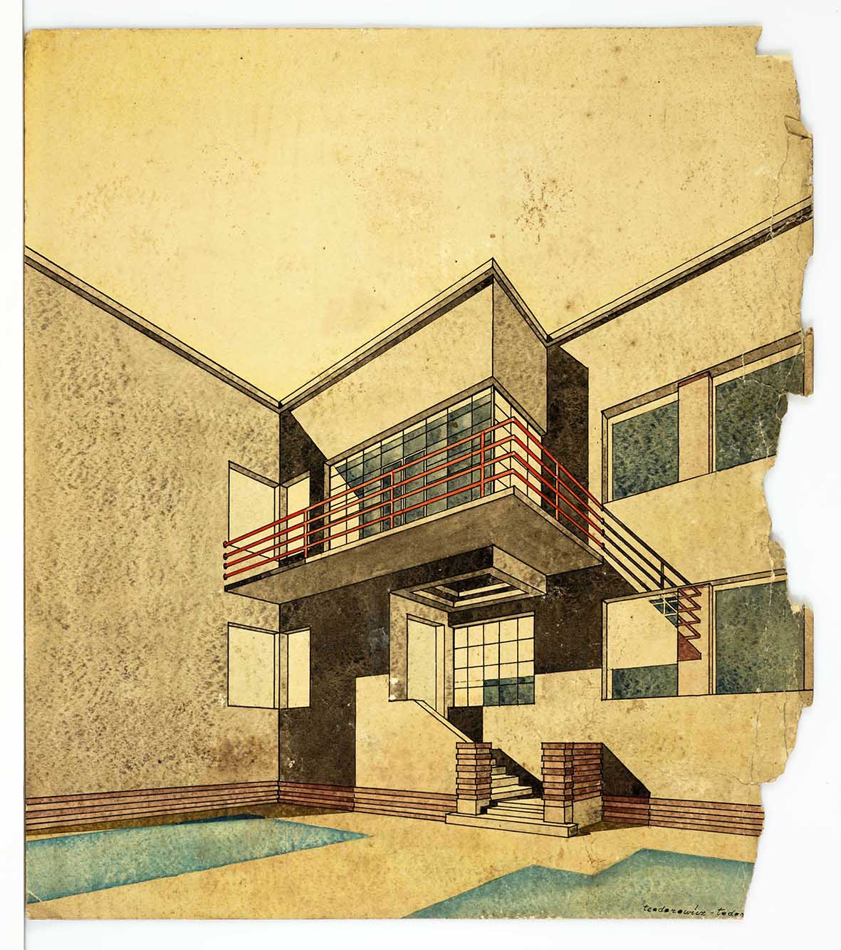 Tadeusz Teodorowicz-Todorowski, projekt szpitala, praca studencka z przedmiotu „Budownictwo utylitarne” prowadzonego przez prof. Władysława Derdackiego, widok perspektywiczny przeszklonego narożnika, 1929, tusz, akwarela i ołówek na kartonie, zbiory Muzeum Architektury we Wrocławiu