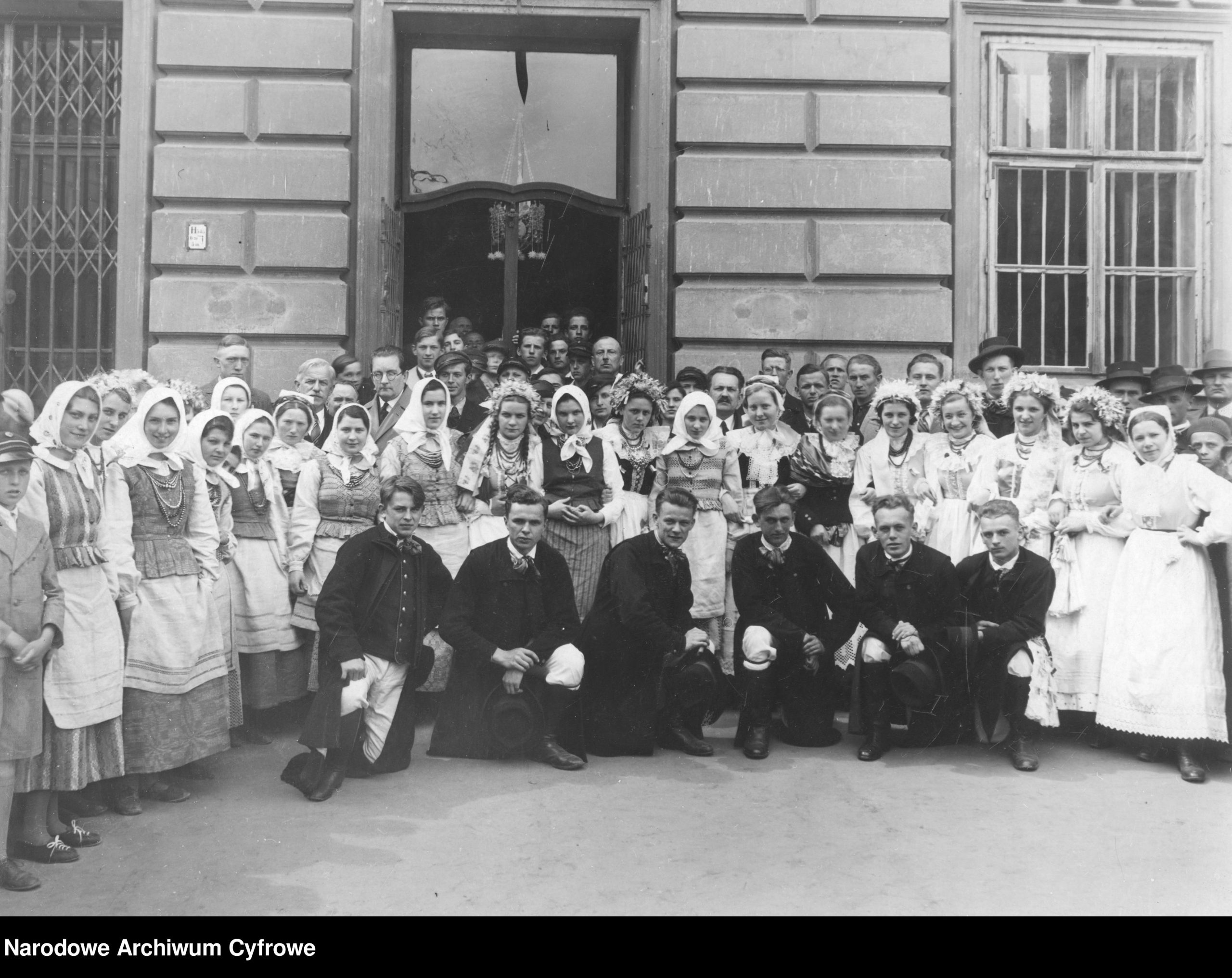 Zjazd kół krajoznawczych młodzieży szkolnej w Krakowie. Grupa uczestników zjazdu w strojach regionalnych, maj 1936,