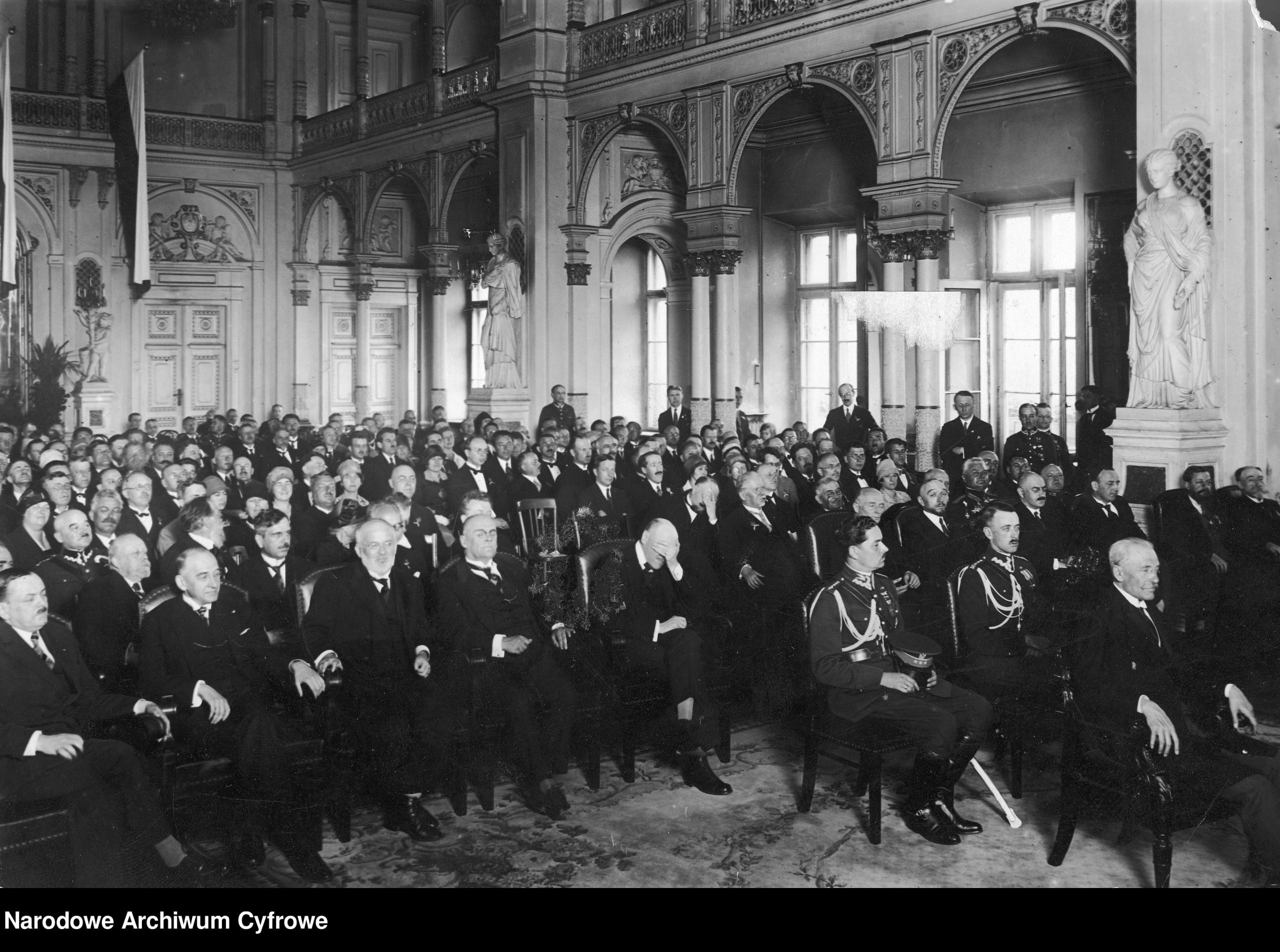 Zjazd geografów i etnografów słowiańskich w Warszawie. Posiedzenie inauguracyjne z udziałem prezydenta Ignacego Mościckiego (siedzi z przodu, z prawej strony), czerwiec 1927,