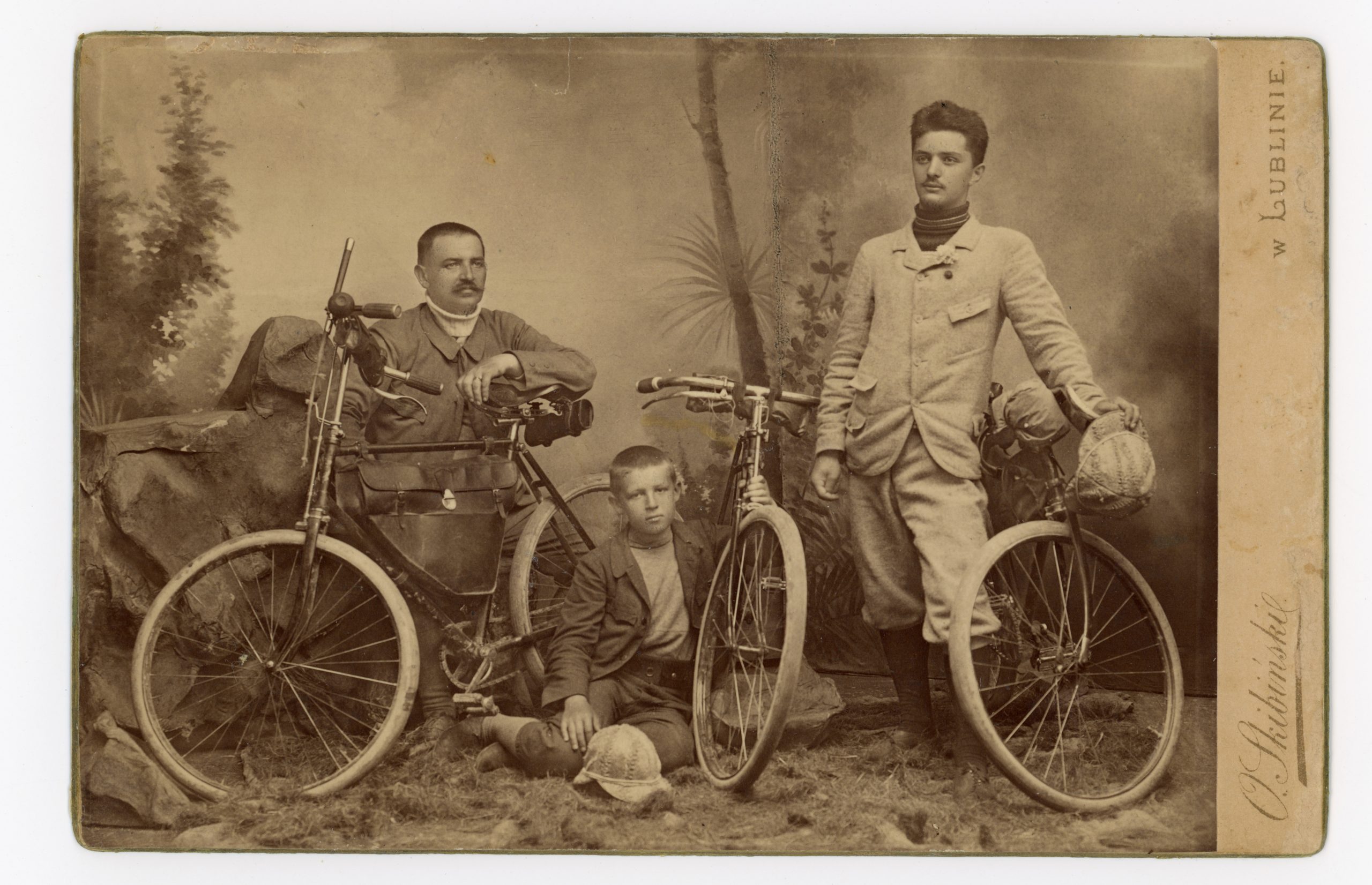 Pamiątkowa fotografia Fertnerów wraz z nieznanym cyklistą z WTC, Lublin 1897 r.
