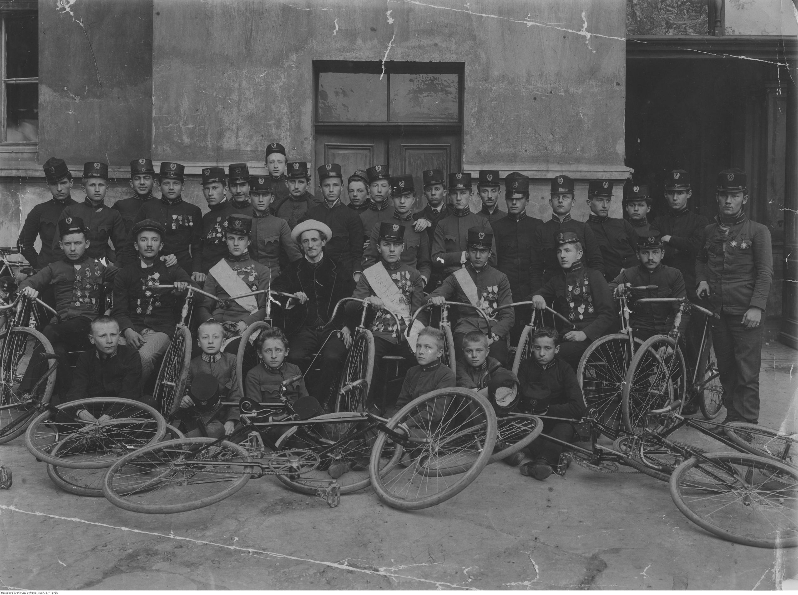 Członkowie Koła Cyklistów Młodzieży Szkół Średnich, Kraków 1907 r. Pośrodku w kapeluszu Rudolf Wacek.