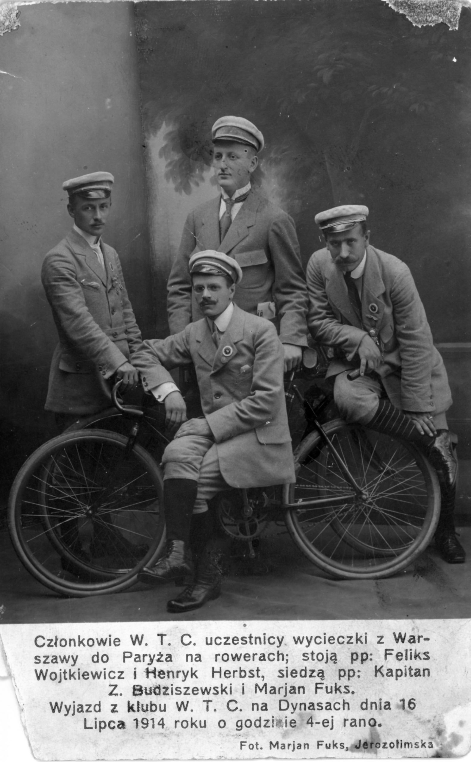 Jeszcze mniej szczęścia miała czwórka podróżników z WTC. Wyjechali do Paryża w połowie lipca, cel osiągnęli, ale podczas powrotu przez Niemcy zostali zatrzymani i osadzeni w obozie internowania. Żadnemu z cyklistów-turystów krzywda się nie stała. Jeden z nich Marian Fuks (1884-1935) znany w czasach II RP fotoreporter, miał ze sobą aparat fotograficzny. Niemcy nie tylko aparatu nie skonfiskowali, ale też pozwolili robić zdjęcia. Dziś zbiór zdjęć z obozu internowania w latach 1914-15 jest przechowywany w Muzeum Sportu i Turystyki. Na fotografiach można zobaczyć warszawskich cyklistów dumnie pozujących w charakterystycznych biało-zielonych czapeczkach swego WTC. W zbiorach muzealnych jest też paszport jednego z internowanych kolarzy – Feliksa Wojtkiewicza, a w nim administracyjny wpis o internowaniu członków WTC.