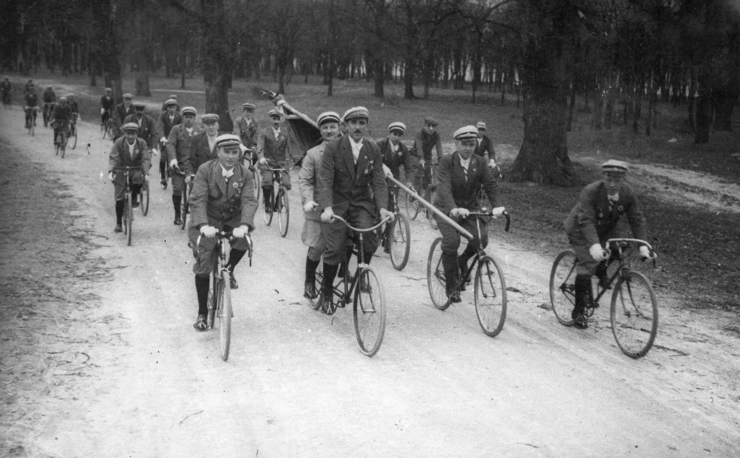 Wycieczka WTC na Bielany w 1922 r. Z przodu na tandemie przyszły srebrny medalista olimpijski Franciszek Szymczyk. Zbiory Muzeum Sportu i Turystyki