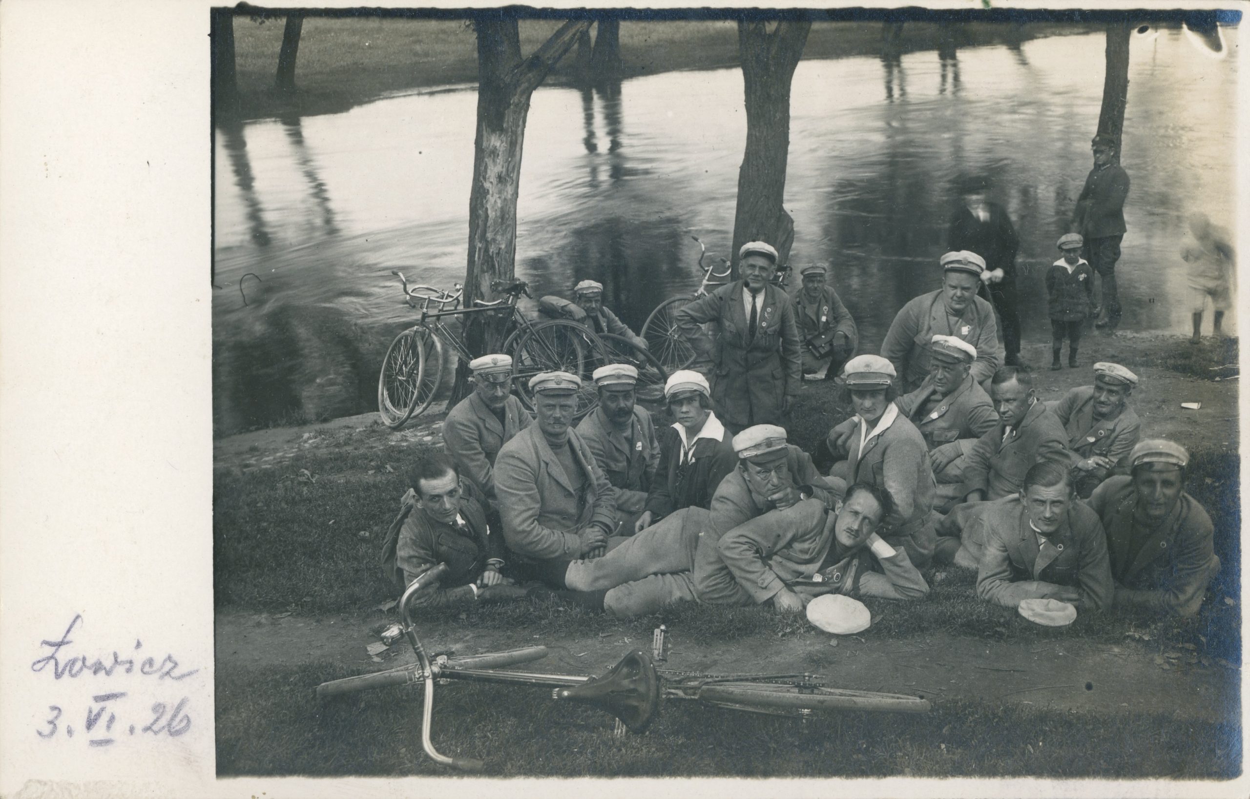 Łódzcy cykliści odpoczywają nad Bzurą podczas wycieczki do Łowicza, 1926 r.